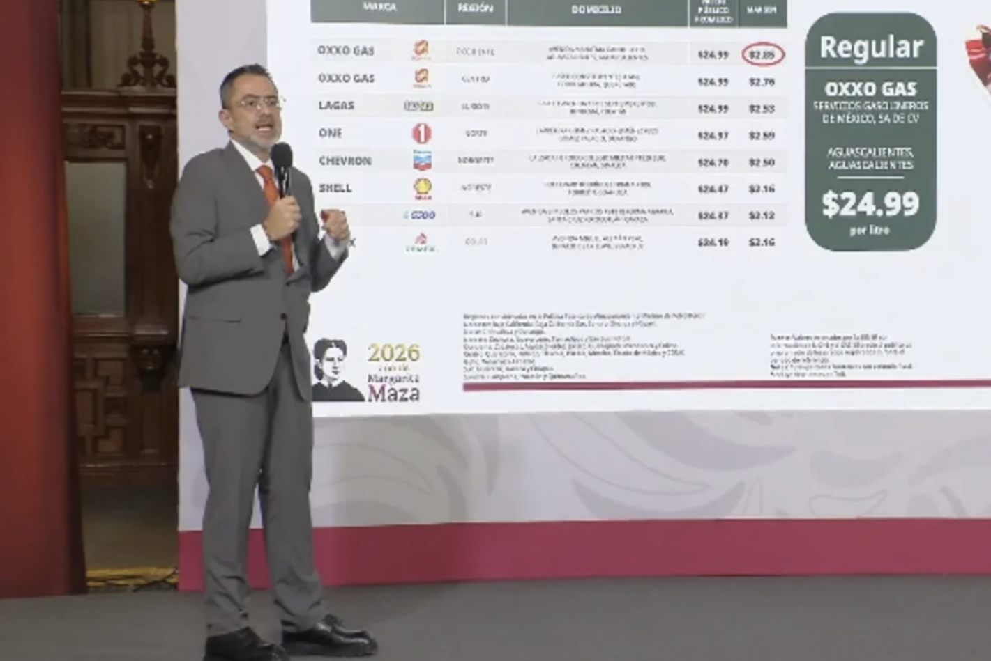 El precio promedio nacional de la gasolina regular al 3 de abril de 2026 fue de 23.70 pesos por litro. No obstante, Sheinbaum advirtió sobre irregularidades: “No puede ser que haya gasolineros que, de manera tramposa, estén subiendo el precio a pesar de que se está dando el apoyo para que no suba tanto el precio ni de la gasolina magna ni del diésel”. Se identificó una estación de OxxoGas en Aguascalientes que vendía el litro a 24.99 pesos con un margen de ganancia de 2.85 pesos, por encima del límite acordado de dos pesos.