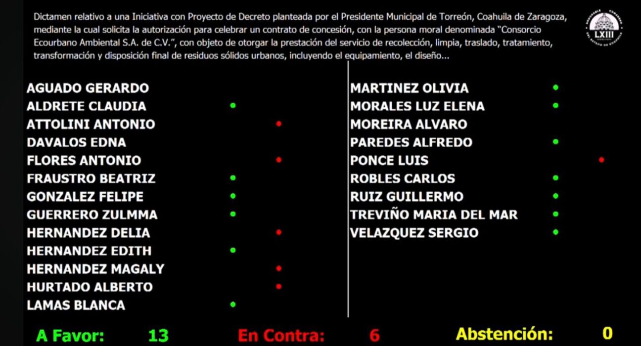 Torreón, 31 de marzo de 2026.- El Congreso de Coahuila aprobó por mayoría de votos el decreto para la celebración del contrato de limpieza entre el Ayuntamiento de Torreón y la empresa Consorcio Ecourbano Ambiental.