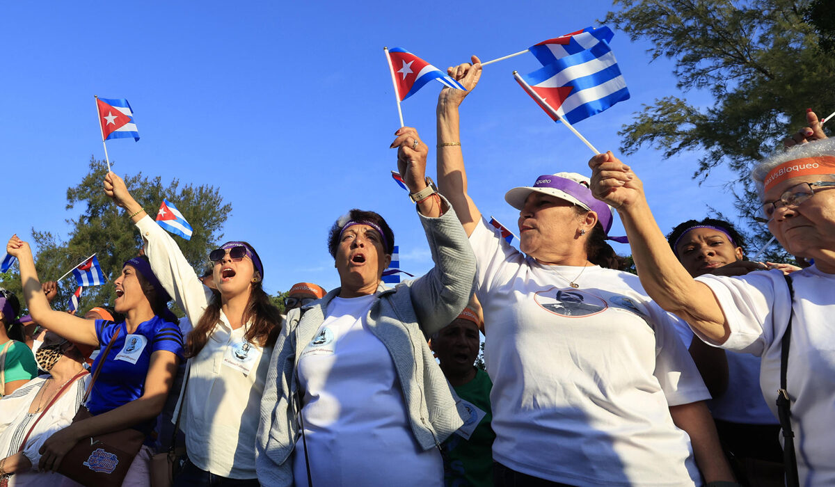 AME858. LA HABANA (CUBA), 07/04/2026.- Personas participan en una manifestación este martes, en el parque Mariana Grajales en La Habana (Cuba). Centenares de cubanos expresaron su rechazo a las sanciones impuestas por Estados Unidos, en un contexto de creciente crisis en la isla, agravada por el reciente endurecimiento de estas medidas, incluido el bloqueo petrolero aplicado desde enero. EFE/ Ernesto Mastrascusa