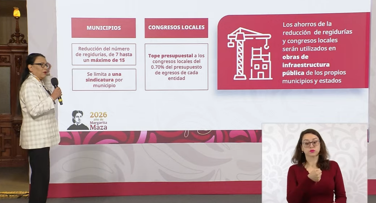 El paquete de medidas incluye la reducción de regidurías municipales a un máximo de 15 y mínimo de 7, el establecimiento de un tope presupuestal para congresos locales del 0.7% del gasto estatal y una reducción progresiva de gastos en el Senado hasta alcanzar un 15%. Además, mantiene la elección de 850 juzgadores del Poder Judicial para el año 2027.