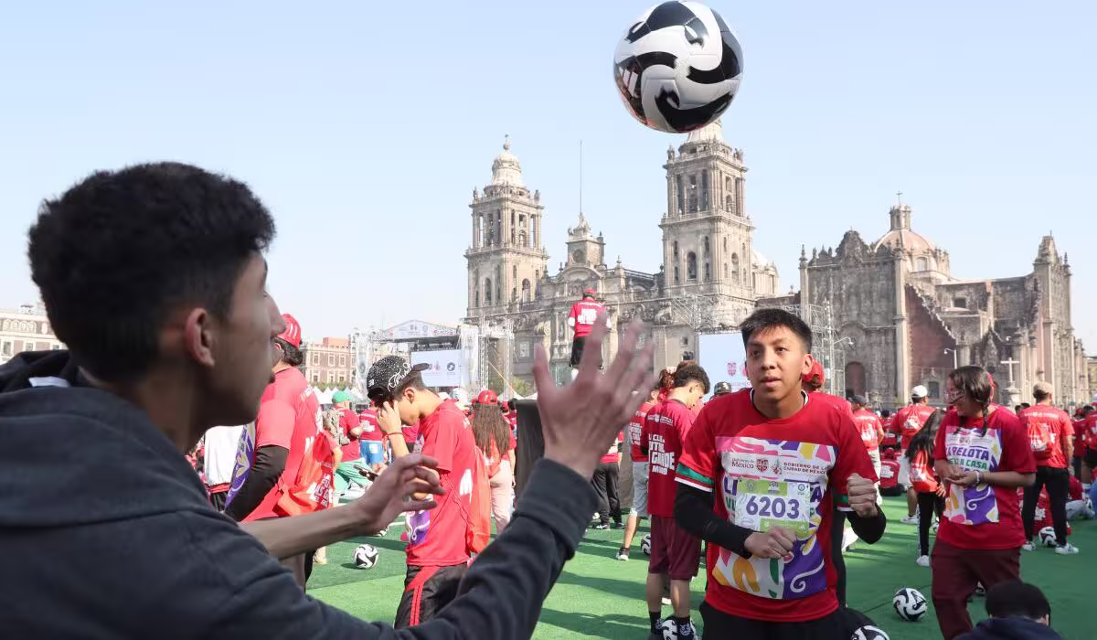 Zócalo Capitalino (Plaza De La Constitución), Ciudad De México, 16 de marzo de 2026.- La Ciudad de México obtuvo oficialmente un Récord Guinness por organizar la clase de fútbol más grande del mundo, con la participación confirmada de 9,500 personas en el Zócalo capitalino. El evento, realizado el domingo 15 de marzo sobre un campo de césped artificial instalado para la ocasión, duró 35 minutos continuos y contó con la presencia de la jefa de Gobierno, Clara Brugada, así como de exfutbolistas y figuras del deporte nacional, en el marco de la cuenta regresiva para la Copa del Mundo 2026.