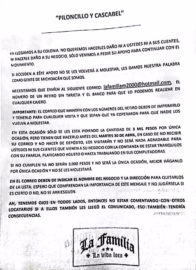 Llegó el cobro de piso a la Colonia del Valle. Pasaron dejando cartas para exigir 3 mil pesos para no hacerles ningún daño.