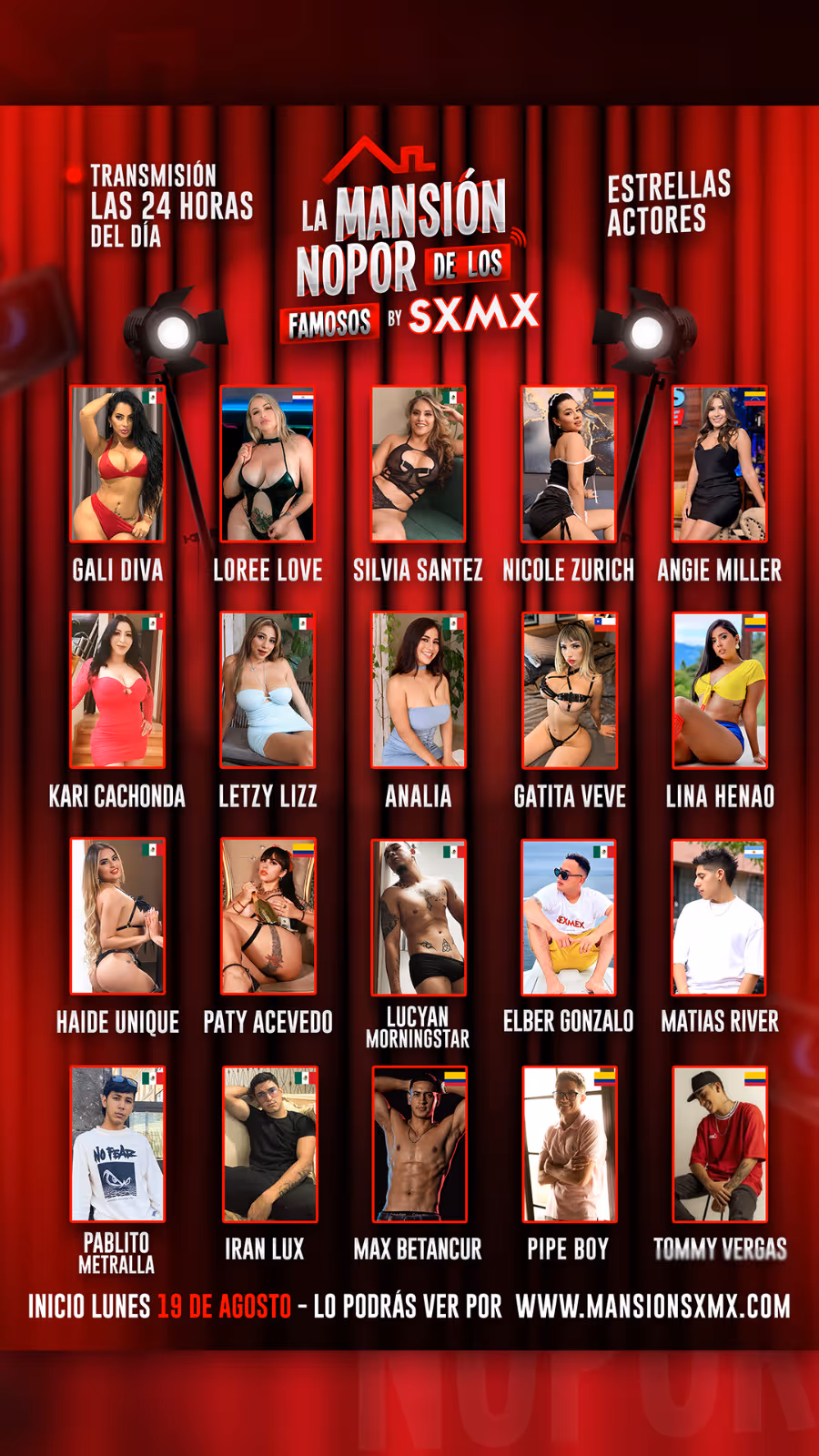 El elenco de La Mansión SexMex está conformado por las siguientes 20 estrellas de la industria: