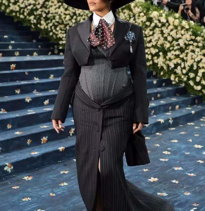 Rihanna volvió a robarse los reflectores al revelar su tercer embarazo durante la Met Gala 2025. Como ya es costumbre, la cantante barbadense eligió una entrada dramática y fue la última en pisar la alfombra roja del Museo Metropolitano de Arte de Nueva York, donde lució un conjunto de raya diplomática de Marc Jacobs, corbata de lunares y un sombrero extra grande, que acentuaban su incipiente barriguita.