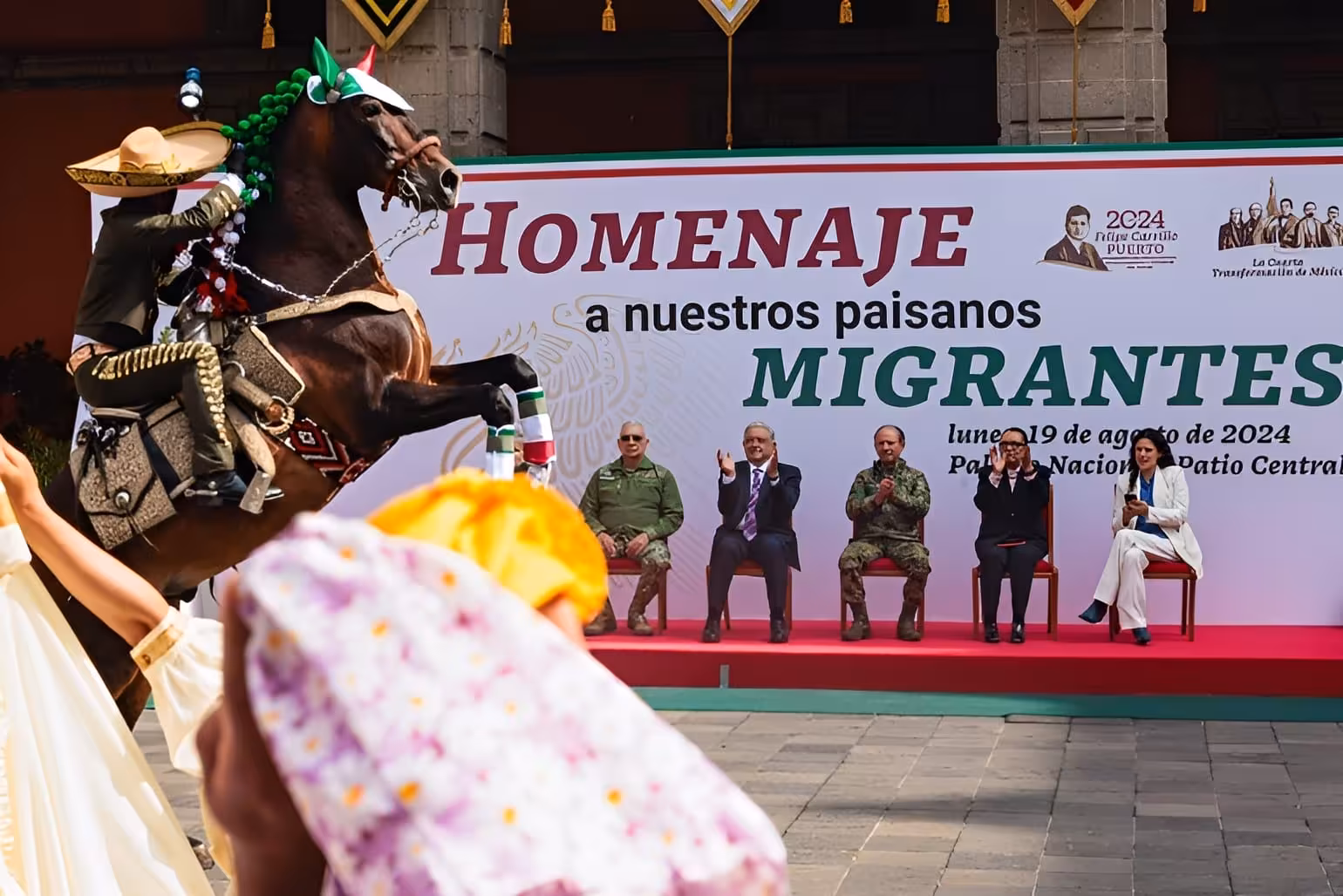 El homenaje a los migrantes mexicanos incluyó un emotivo concierto de música regional y danzas tradicionales, a cargo de la Banda de Música Representativa del Ejército y Fuerza Aérea Mexicanos, el Mariachi y Ensamble Folklórico de la Secretaría de la Defensa Nacional, y el Ballet Folklórico de la Sedena y de la Guardia Nacional.